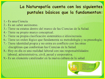 Una Profesión y una Ciencia, la Naturopatía estudia la naturaleza en general y la naturaleza humana en particular, aportando con los conceptos de salud y perdida de salud, natura y contra natura, la idea teleológica y normativa universal de la physis. Por lo que la Naturopatía cuenta con ocho puntales básicos que la fundamentan: