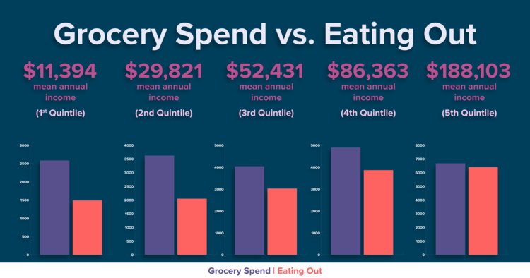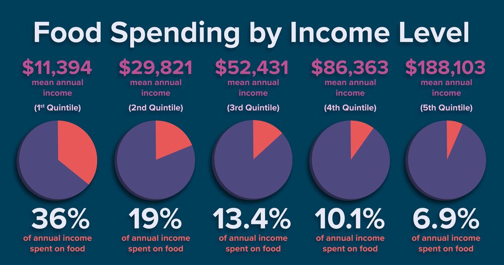 ¿En cuanto a los rumores sobre familias pobres llenas de refrescos y dulces? Los miembros del quintil inferior enfatizan las frutas y verduras más que cualquier otro grupo de ingresos. De hecho, dedican casi el 2% de su presupuesto a esa sección de la pirámide alimentaria en comparación con el 1,1% de los ricos “. – ‘¿Cuál es el costo promedio de los alimentos en el hogar?’
